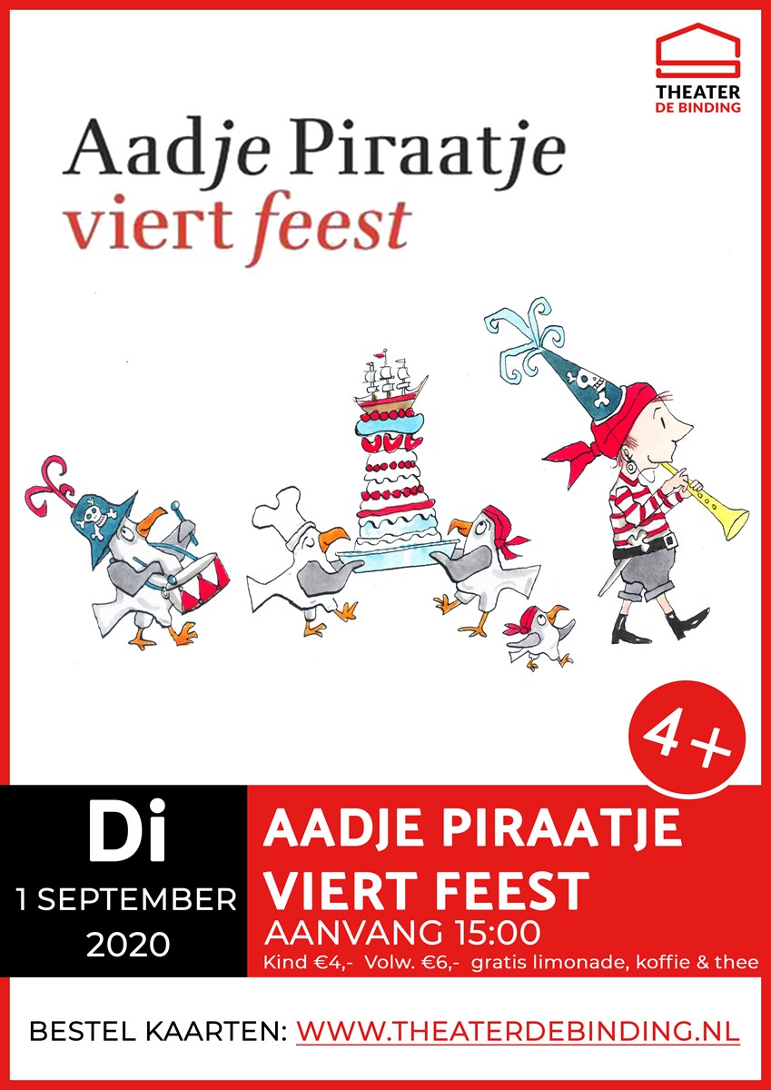 Avonturiers opgelet! Op dinsdag 1 september komt Aadje Piraatje naar Theater de Binding in Zuid-Scharwoude. Om 15:00 speelt Ton Meijer een spannende theatervoorstelling gebaseerd  op het boek van Marjet Huiberts en Sieb Posthuma; Aadje Piraat in gevaar. Ton Meijer vertelt, zingt en speelt.