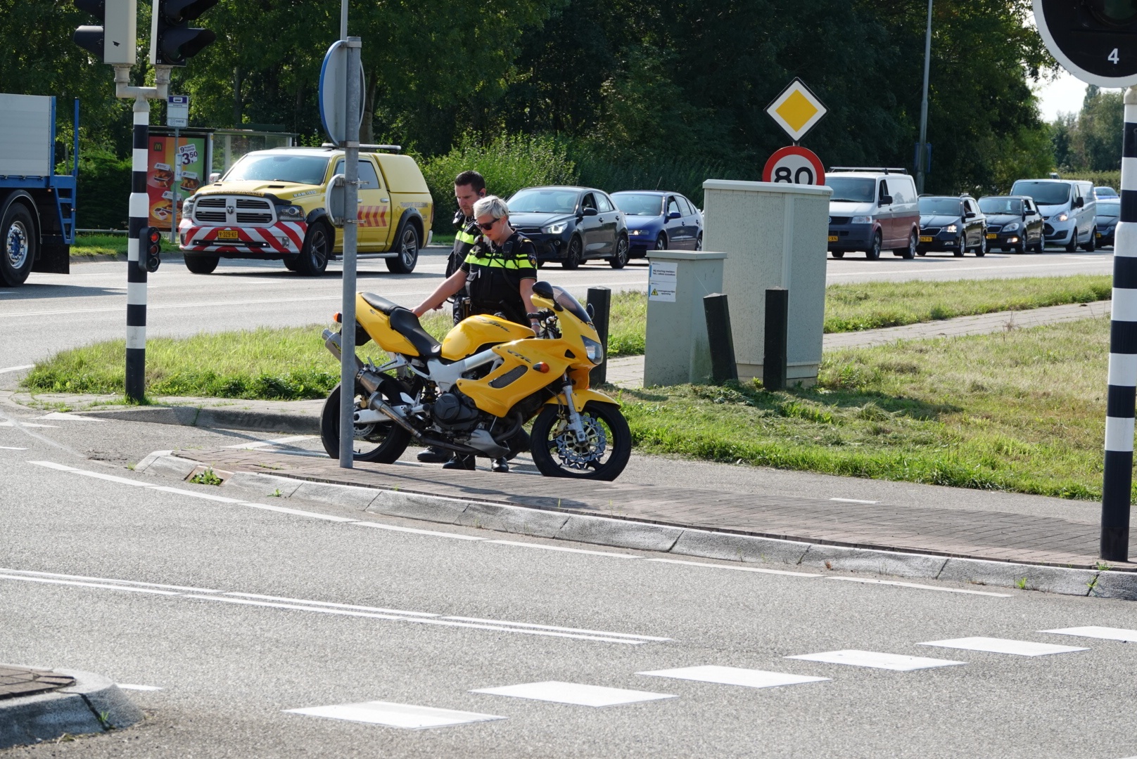 Vanmiddag is er bij een verkeersongeval op de N242 een motorrijder aangereden door een pakketbezorger. De motorrijder stond stil bij de stoplichten en de pakketbezorger zag hem over het hoofd en reed hem hard aan. Ambulance personeel heeft de gewonde motorrijder meegenomen naar het ziekenhuis. Zijn motor is door een bergingsbedrijf opgehaald.